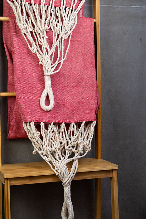 Relájate y disfruta. Hamaca de tono rojo, confeccionada a mano con hilos de algodón reciclado, logrando una combinación elegante en cualquier ambiente.